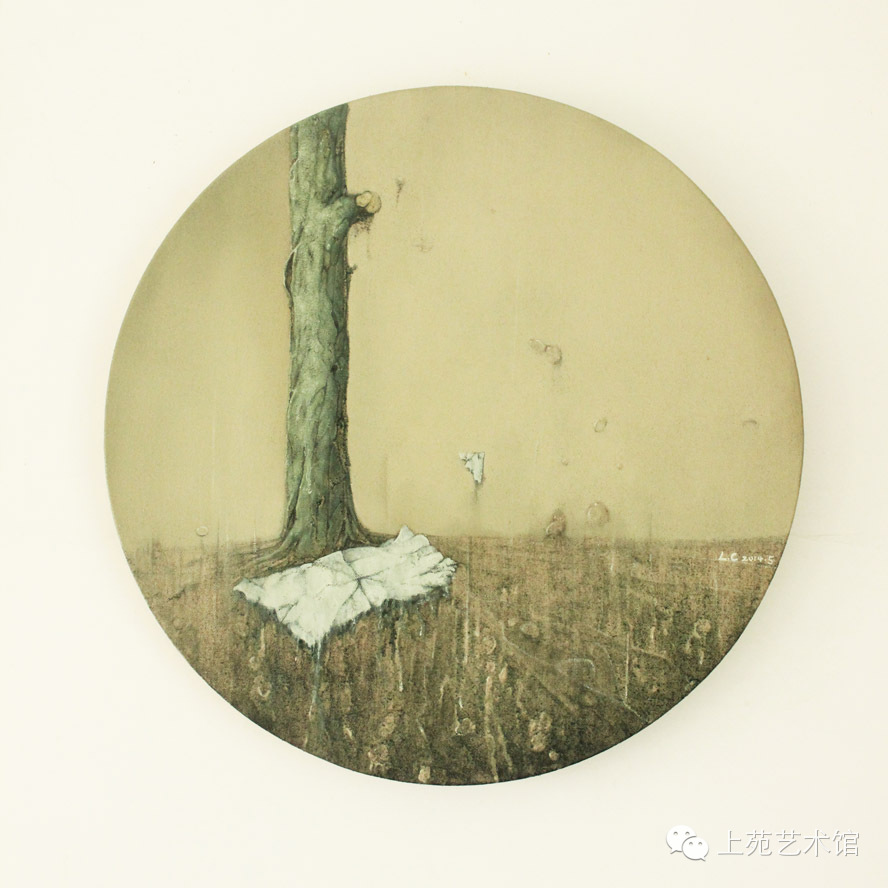 在李创大大小小、方方圆圆的作品前站定,一种跨越年龄的敬意由心而生。从这些画面里我看到了诗人的气质,思想的闪烁。李创对物背后的故事有着宗教般的注释,所有的作品都呈现出人类长远历史的痕迹。就他23 岁这个年龄,似乎是神派驻到上苑艺术馆里来的小智者。