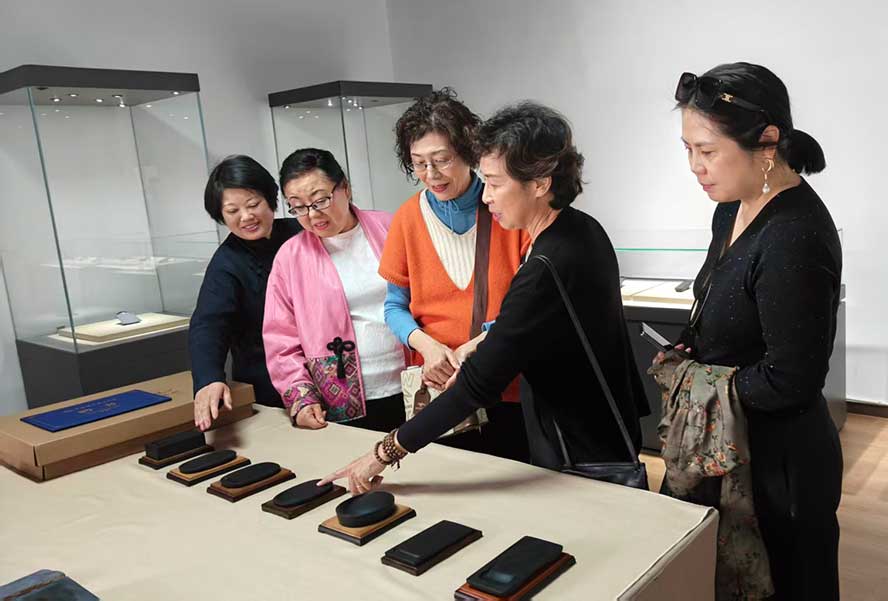 王瑞蕓與會作家藝術家(左起林昱同、陳瑞琳、元山裡子、王瑞芸、趙琍)田園調查之“歙硯非遺傳承人朱岱工作室”。