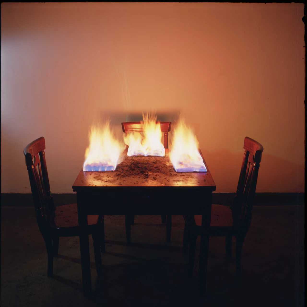 材料:木制桌椅,三本书分别是中文版《论语》;英文版《圣经》;阿拉伯文版《古兰经》,一支蜡烛,火药若干