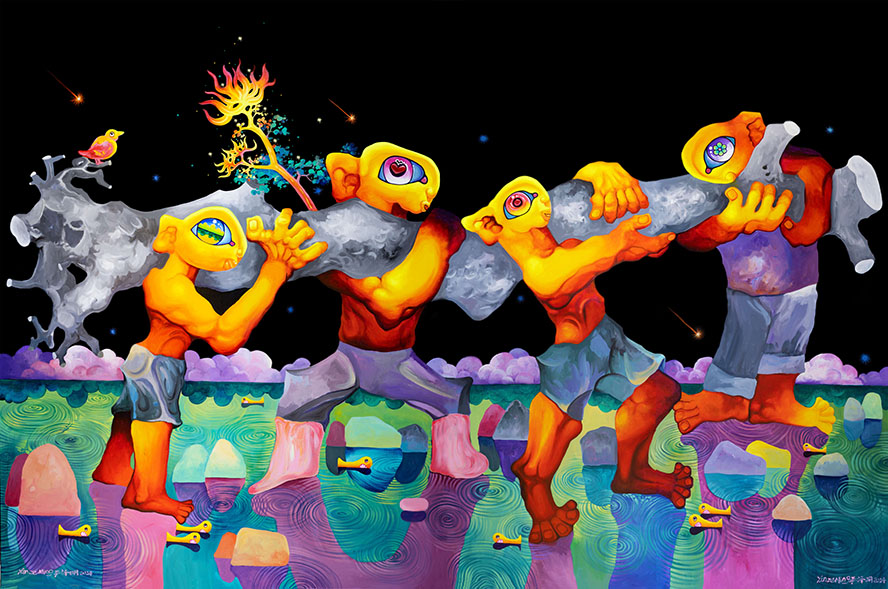 战争-纸上油画、木材、陶瓷-163×27.5×2.1cm-2025