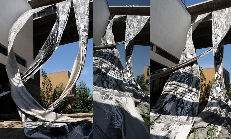 那线条——画,迎合了上苑艺术馆建筑的几何形式,并且改变了空间中绘画的尺寸和观感。光线与影子参与了创作的过程。空间、空气与地形是它的框架,由此那些线条因穿过它们而使其更完整,移动的线条置换并成为这个场景中的一个基本元素。