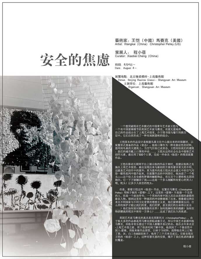 王恺在移动互联网平台上展示他的作品方案时,我建议他将之实施在上苑艺术馆里。最后呈现出来与最初的方案有着非常大的不同,这就是艺术创作中的意外。更为意外的是王恺从社会意义中的空气污染一般性批判中提升起来,在装置作品的中间部位,他加进了一个枕头——这个给人安全感和梦源的睡眠物品,有五百个口罩将枕头团团抱住。它一下子就触动了我——这是一个多么细腻和有爱心的男人!哦,枕头!让多少人依恋的枕头。